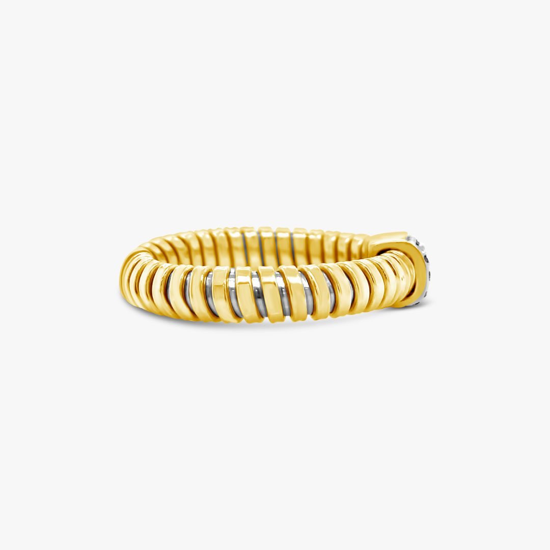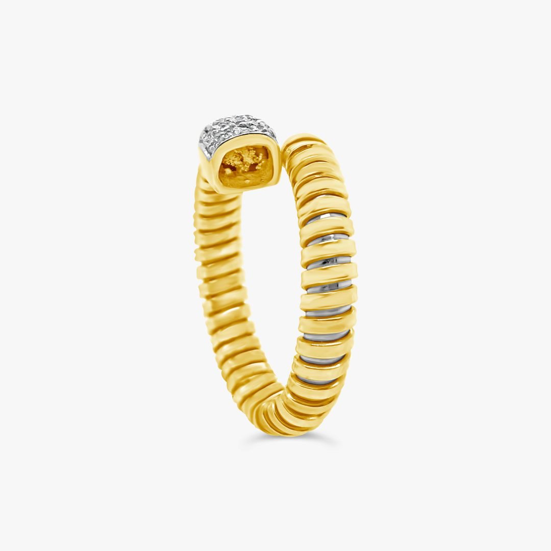 Diseñado en oro amarillo de 18K, este anillo ofrece una estructura flexible que permite lucirlo abierto o cerrado según el estilo deseado. En el centro, diamantes talla brillante se destacan sobre una base de oro blanco de 18K, aportando luz en el punto ideal. Una pieza pensada para adaptarse.