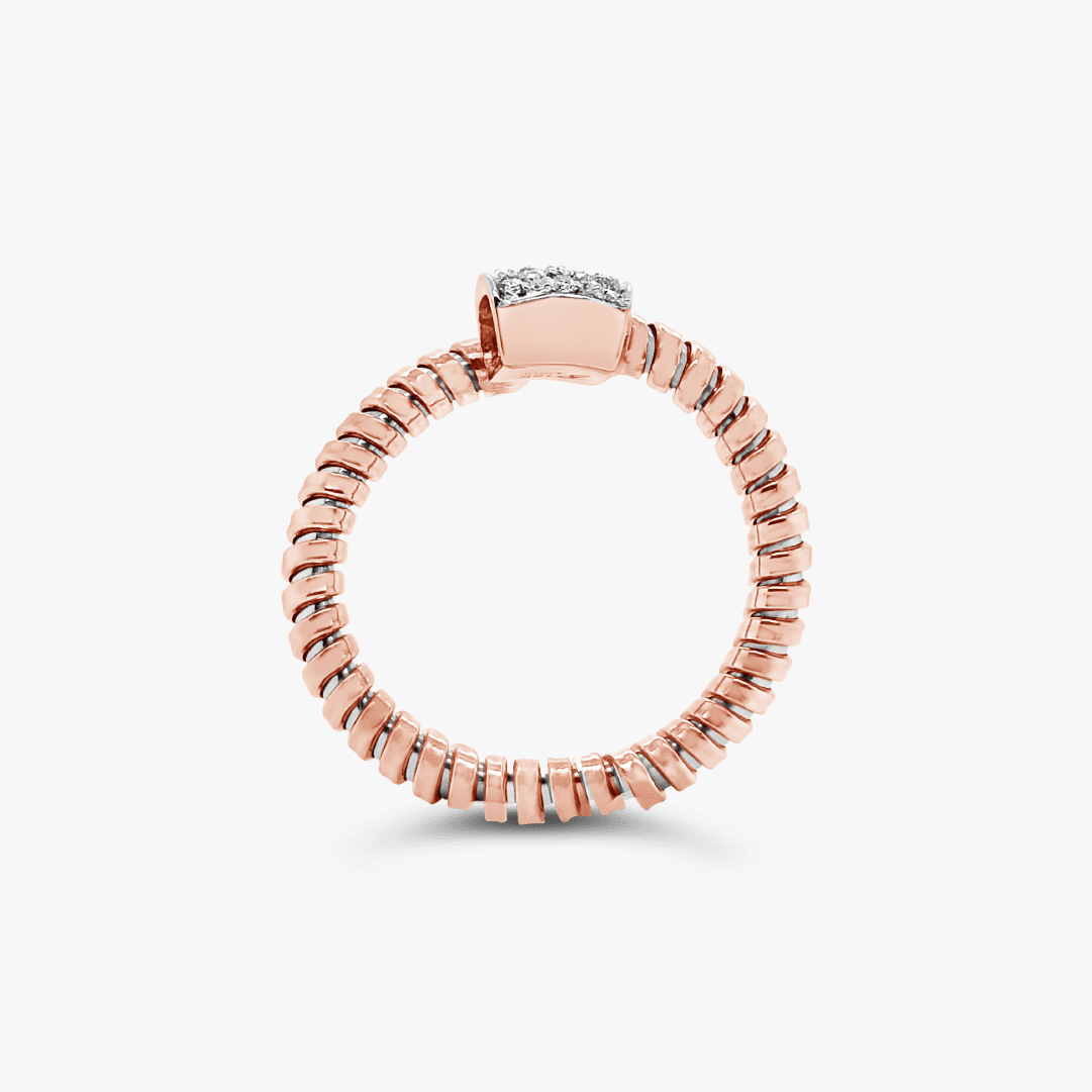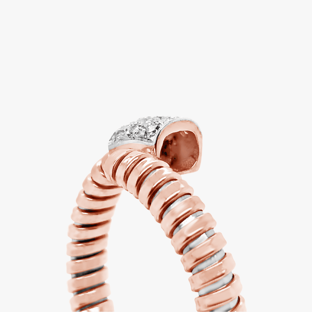 Diseñado en oro rosa de 18K, este anillo ofrece una estructura flexible que permite lucirlo abierto o cerrado según el estilo deseado. En el centro, diamantes talla brillante se destacan sobre una base de oro blanco de 18K, aportando luz en el punto ideal. Una pieza pensada para adaptarse.