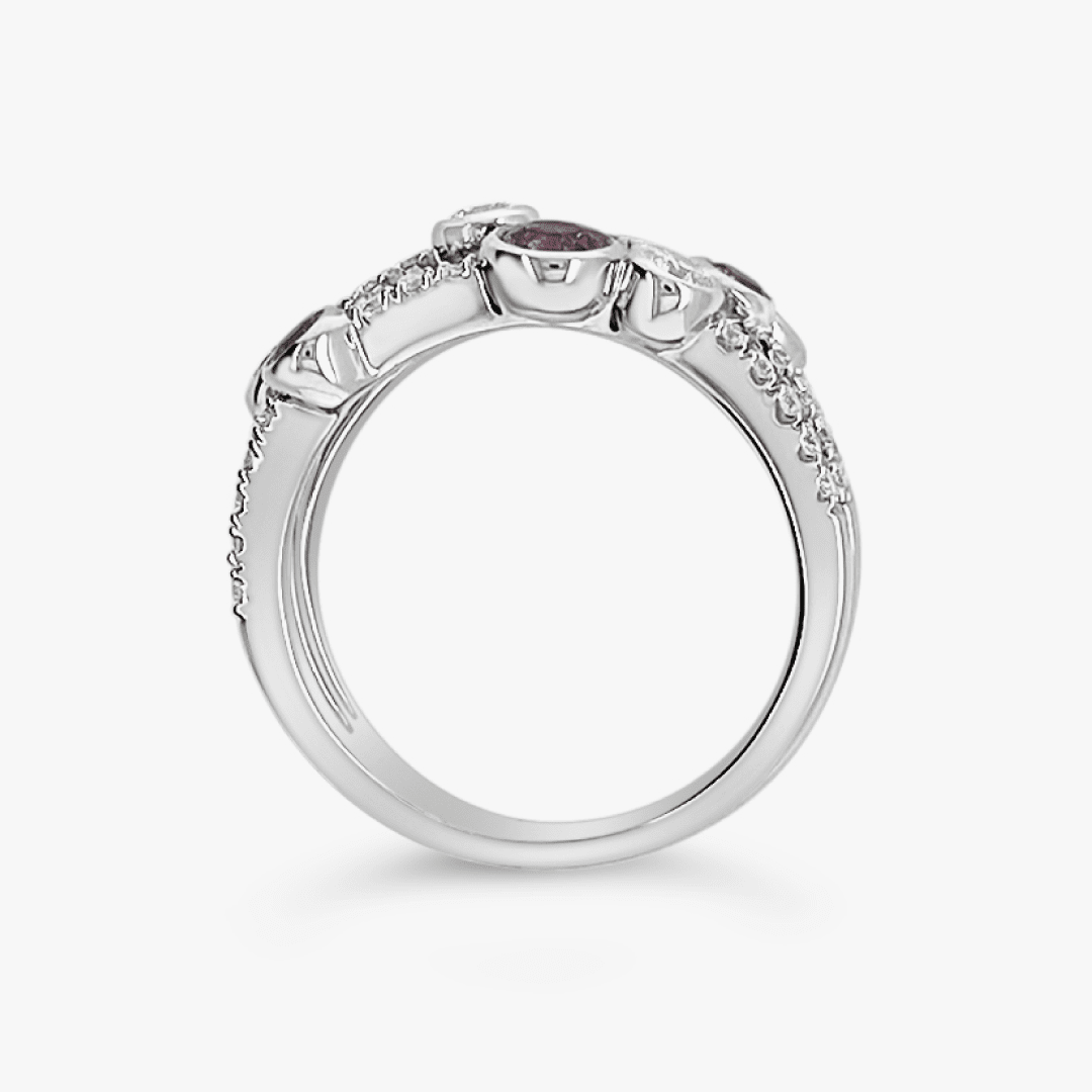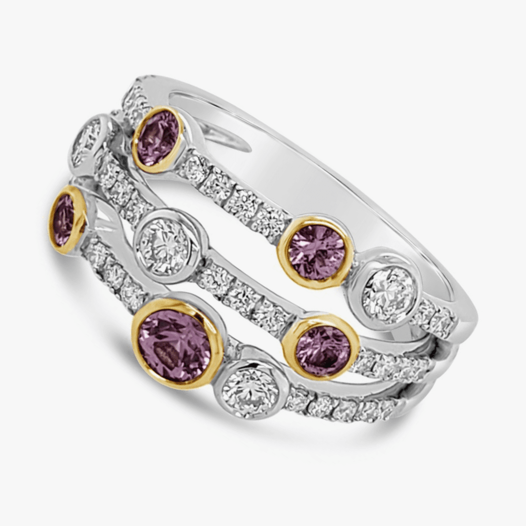 El aro de este anillo se divide en tres equilibradas hileras de diamantes engastados en pavé con acentos de cinco zafiros rosa biselados y cuatro diamantes talla brillante biselados distribuidos desordenadamente para crear una composición muy clásica pero colorida y divertida.