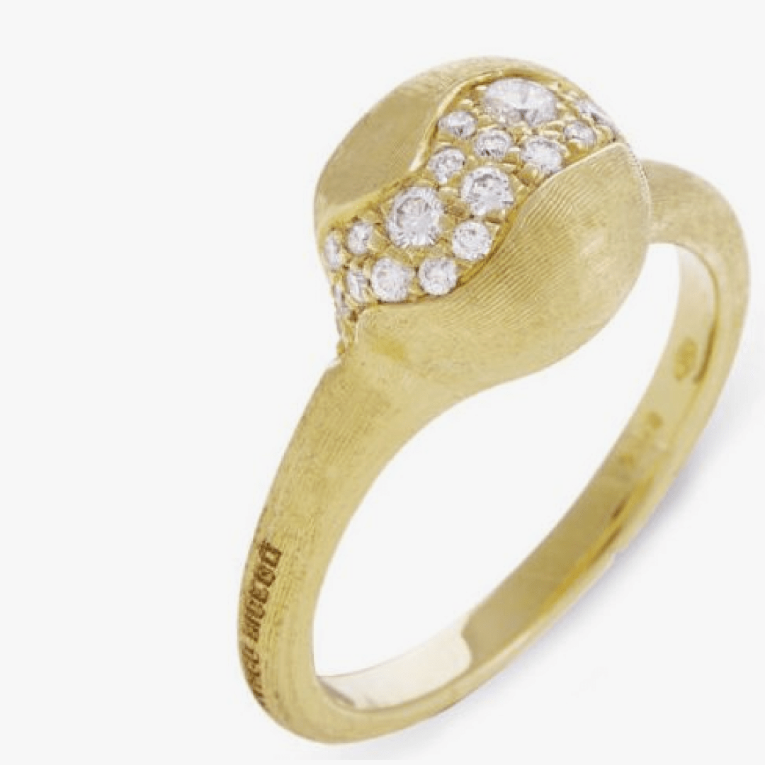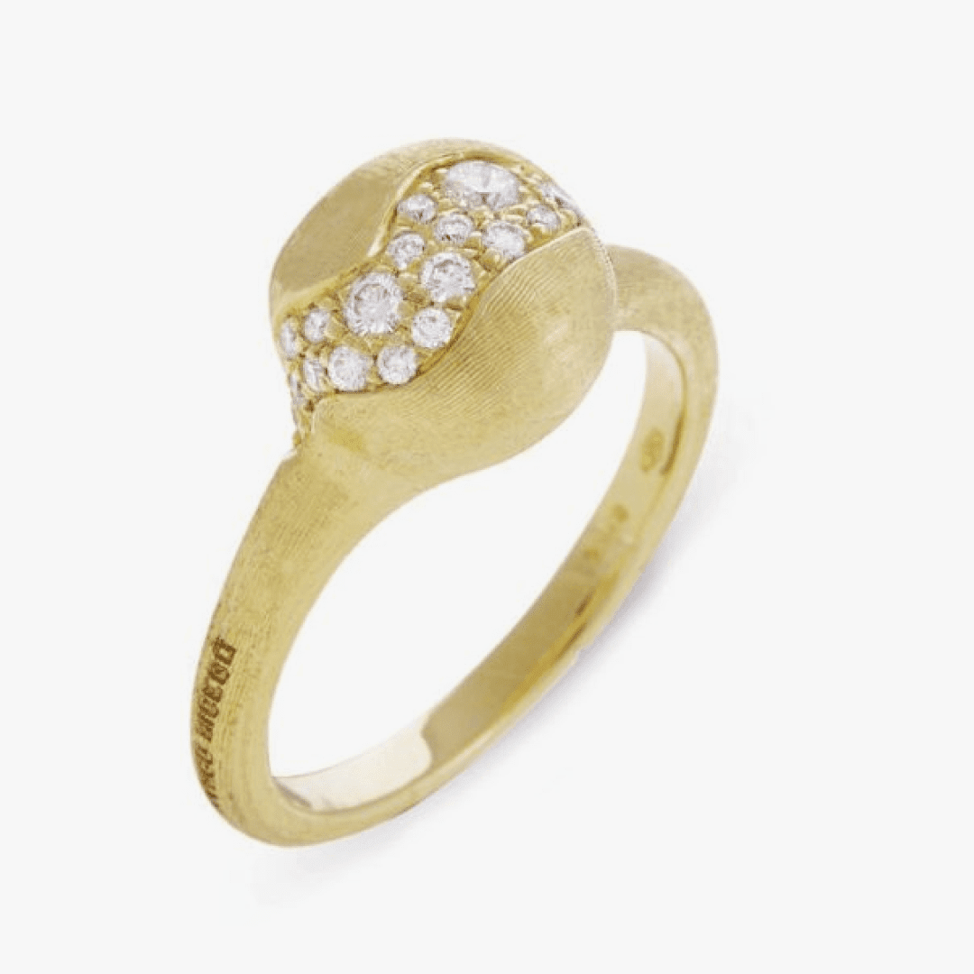 Un sofisticado pavé de diamantes de talla brillante irregular enriquece este anillo de oro amarillo de 18K, grabado a mano con una antigua técnica florentina.