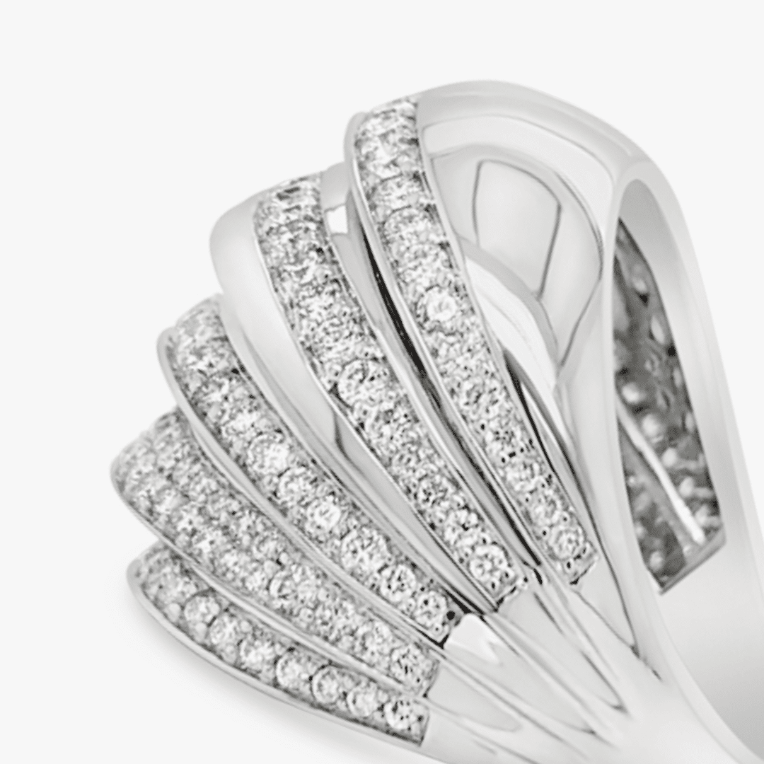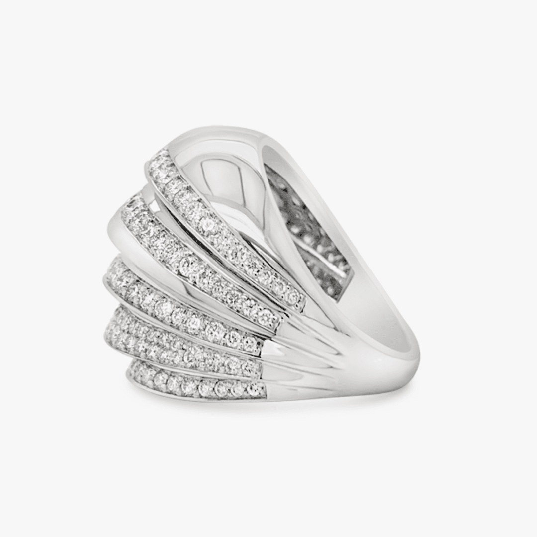 Este anillo abombado reluce un exquisita composición de cuatro hileras de diamantes engastados en pavé, acompañadas de espacios pulidos de oro blanco 18K.
