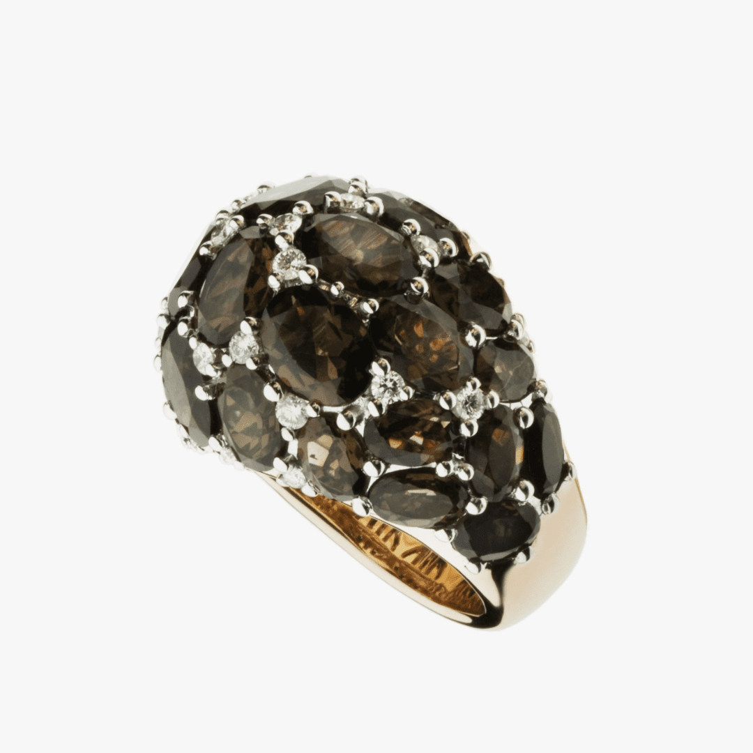 Anillo en oro amarillo 18K con diseño de piedras cuarzo marrón y diamantes talla brillante.