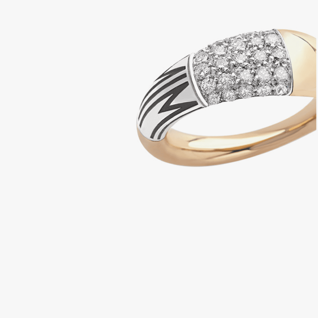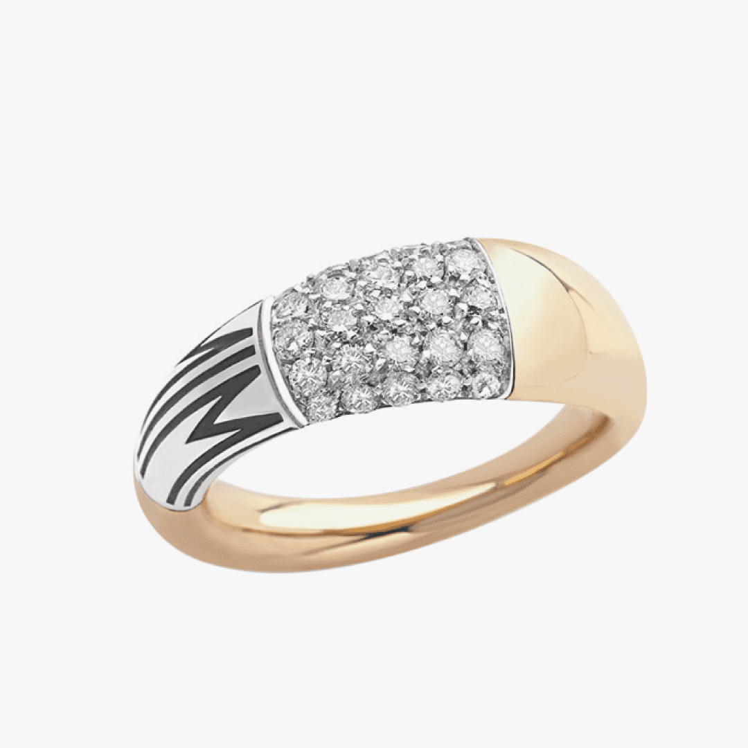 Contemporáneo, materia y luz en perfecto equilibrio. Anillo grande, escultura de líneas y volúmenes, para llevar solo o apilado con otros. Anillo en oro rosa 18K, grabado MIMI en esmalte negro y elemento central en pavé de diamantes sobre oro blanco.