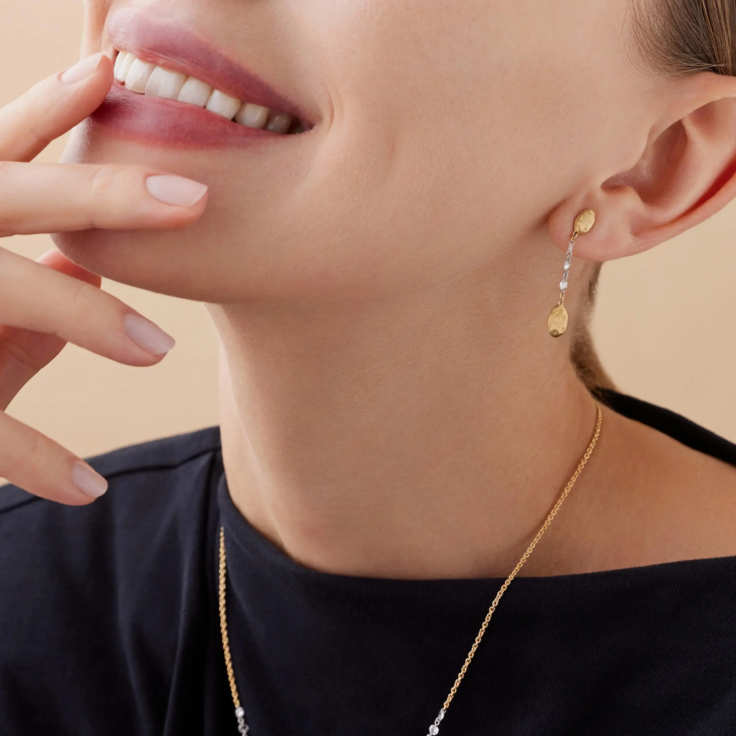 Dos placas de formas orgánicas de oro amarillo de 18 quilates, satinadas y acabadas a mano, se disponen en una fluida secuencia. Entre ellas, delicados diamantes sostenidos en cadenas crean radiantes toques de luz y aportan al diseño un sutil brillo.
