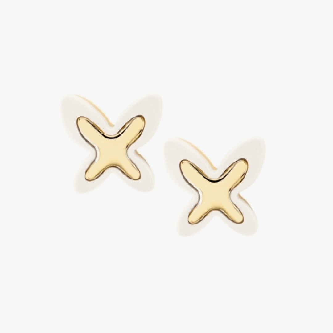 Dos FreeVola volando para descubrir el mundo. Pendientes blancos perfectos en oro y Kogolong. Pendientes de botón en oro amarillo con FreeVola en Kogolong.