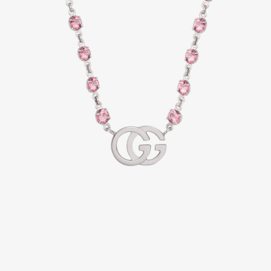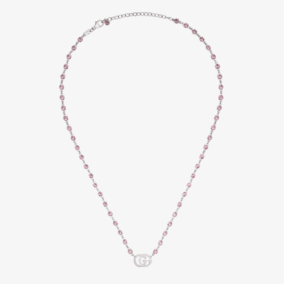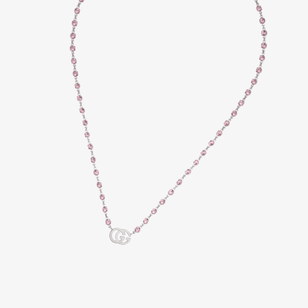 De la cadena en oro blanco 18K adornada con 56 topacios rosa, cuelga el emblemático diseño de la Double G.