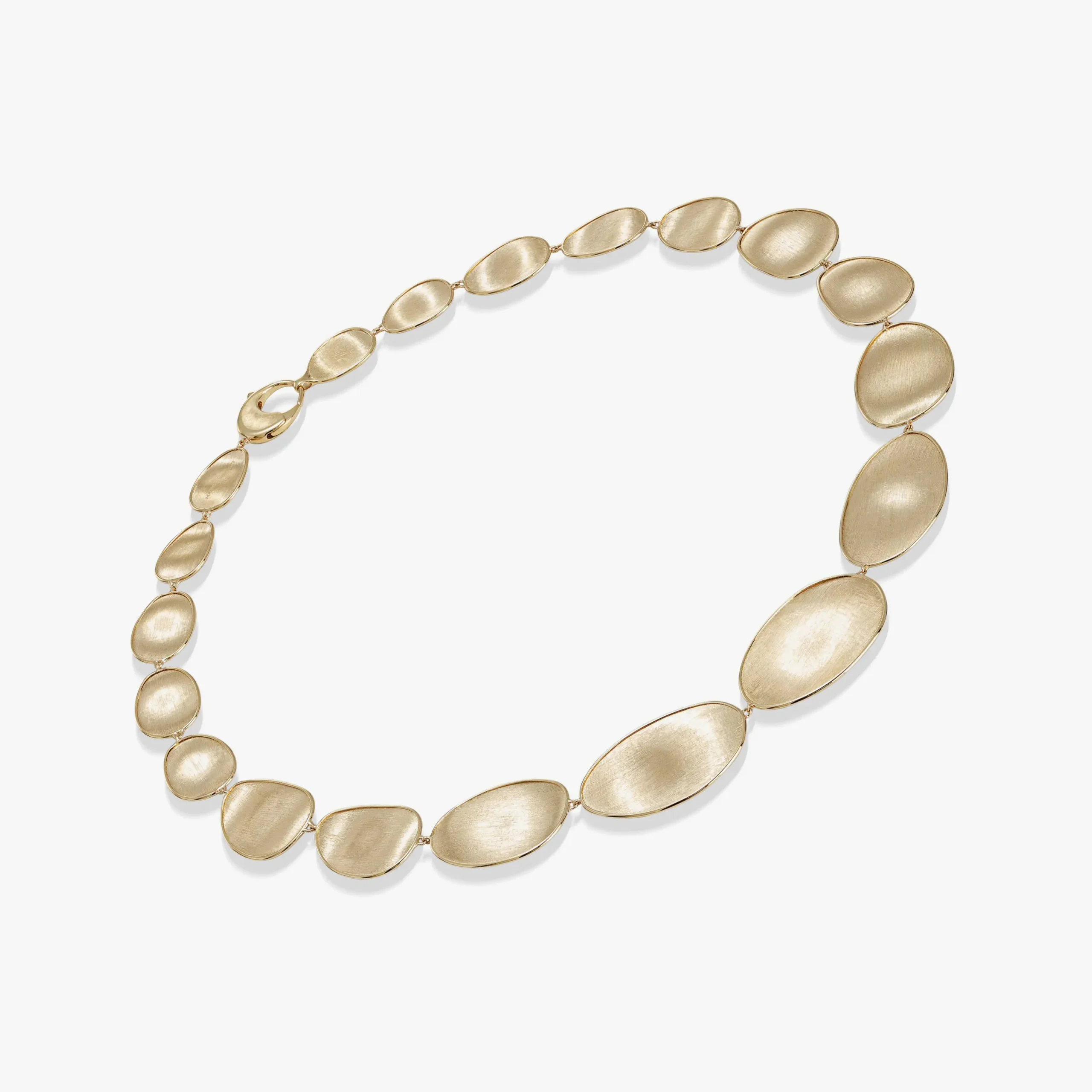 Un collar icónico con un sofisticado diseño de hojas irregulares de oro amarillo de 18 kt, grabadas a mano con una antigua técnica florentina para lograr un acabado brillante y cepillado. Ligera y delicada, esta joya destaca por su personalidad y proporciones.
