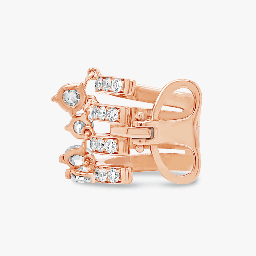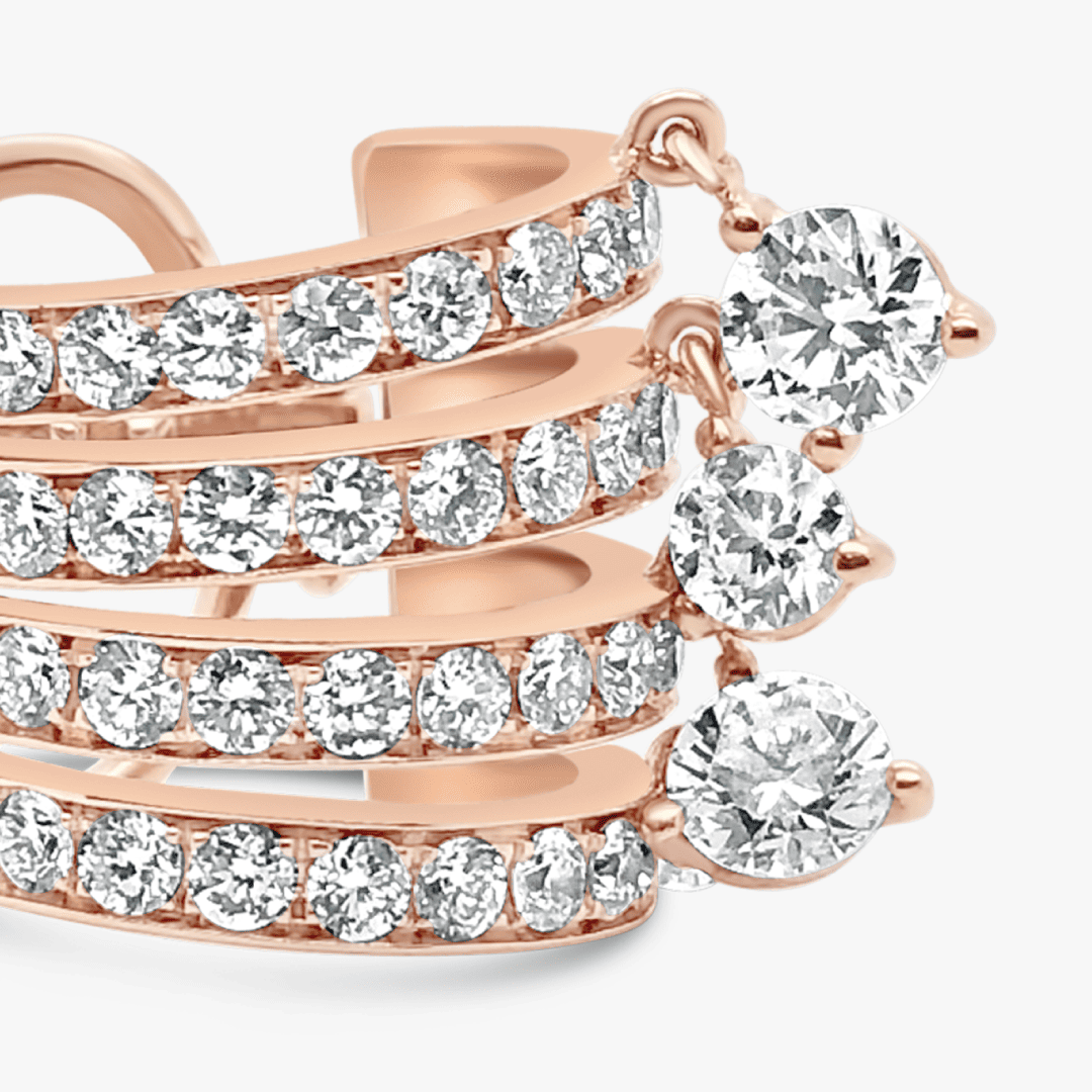 Un ear cuff de 4 hileras de diamantes sostiene pequeños charms de diamantes corte brillante sobre oro rosa 18K.