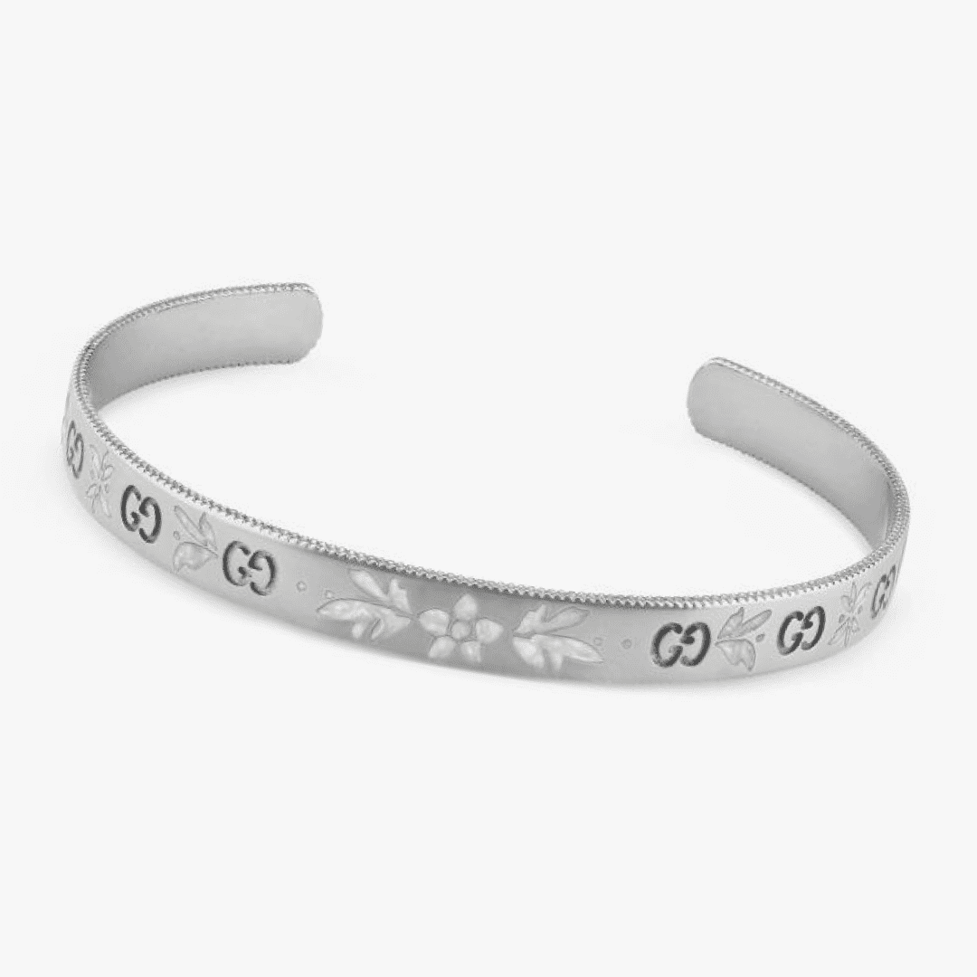 El emblemático patrón GG está grabado en una pulsera de aro abierto oro blanco 18k, acompañado de diseños florales en esmalte blanco
