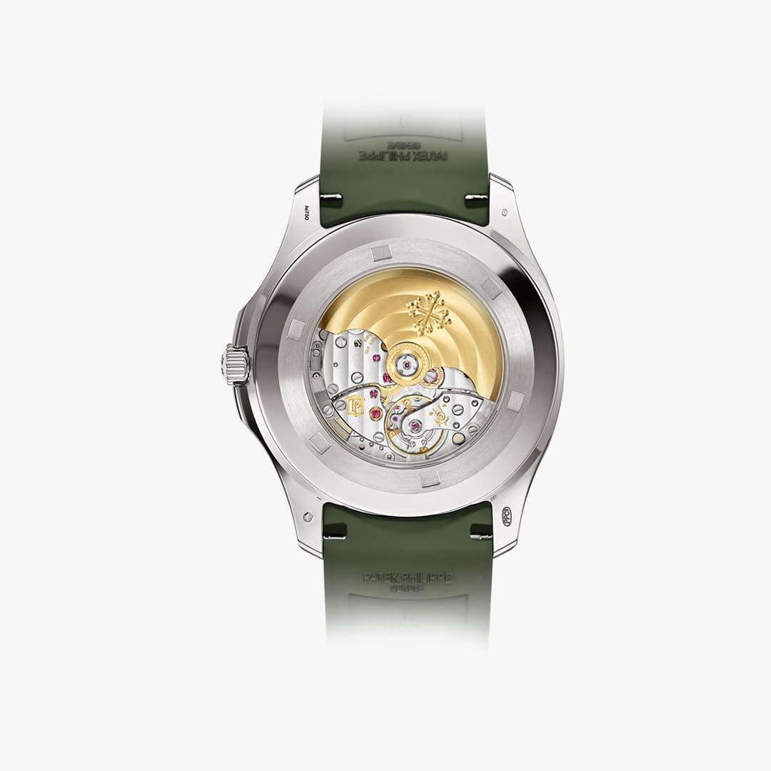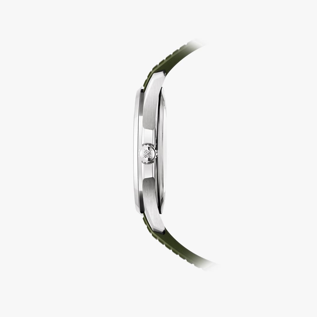 Encarnación del sport chic contemporáneo, el Aquanaut para caballero “Jumbo” (42,2 mm) de oro blanco reafirma su estilo joven y dinámico en una nueva versión verde caqui. Un color original y sorprendente que evoca la aventura y los horizontes abiertos. El diseño de la caja octogonal redondeada y del bisel se ve realzado por la alternancia de acabados satinados y pulidos.
