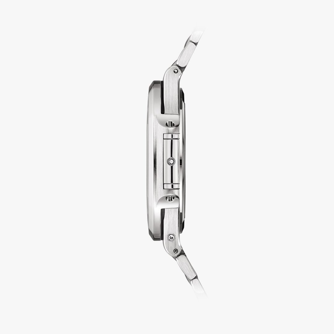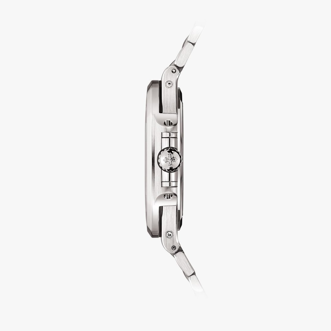El Nautilus con calendario perpetuo referencia 5740/1 es la primera gran complicación de la colección Nautilus. Ofrece una alianza original entre deporte y sofisticación técnica. Gracias a la presencia del famoso calibre extraplano 240 Q de carga automática, la caja, hermética hasta 60 m, conserva una fineza excepcional, lo que lo convierte en el calendario perpetuo más fino de Patek Philippe. El brazalete está equipado con un nuevo cierre desplegable que ofrece una seguridad optimizada.