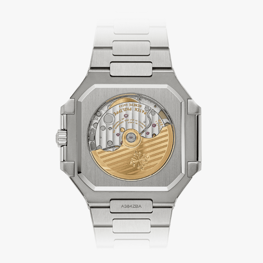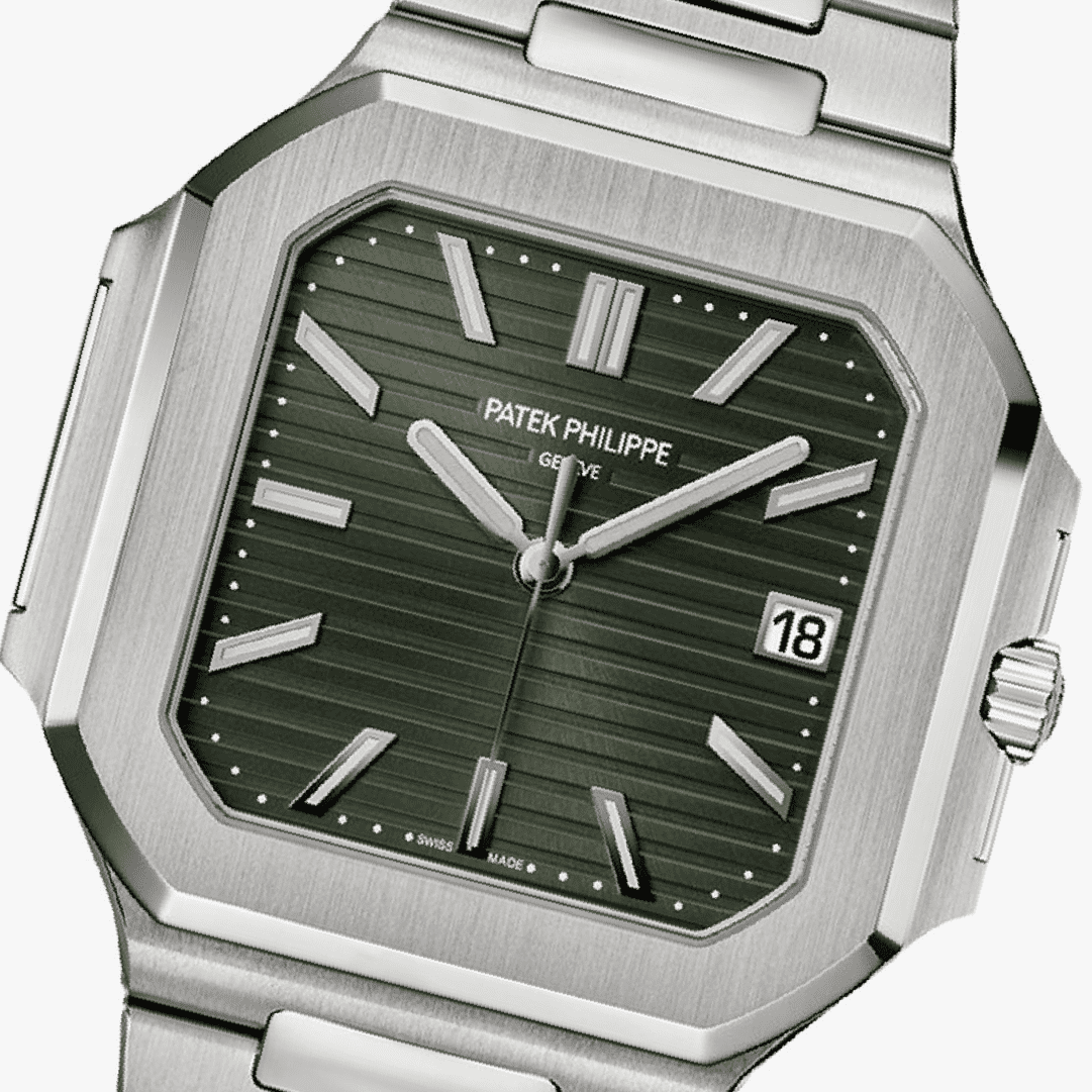 La nueva caja, de forma cuadrada con ángulos redondeados, destaca por su elegante ajuste en la muñeca. La esfera con relieve horizontal acuñado se caracteriza por su refinado color verde oliva soleil. El brazalete de acero está equipado con un sistema de ajuste con bloqueo y un cierre desplegable patentado Patek Philippe, que garantiza confort y seguridad.