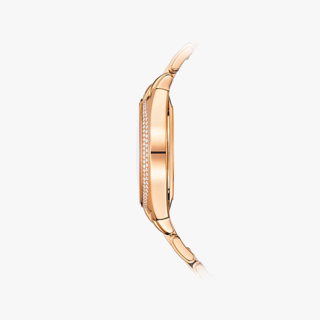 Patek Philippe presenta un nuevo reloj mecánico de cuerda automática para señoras, creado para acompañar con estilo el ritmo de vida de las mujeres activas y modernas. Como nueva interpretación de la elegancia femenina, el Twenty~4 Automático es el primer modelo de esta colección dotado de una caja redonda. La versión de oro rosa, con bisel engastado con diamantes, se ofrece con una esfera marrón sol o plateada, realzada por un satinado vertical y horizontal que evoca la textura de las telas de seda salvaje “shantung”. Las horas se animan al compás del calibre 324 S C de cuerda automática, que puede verse a través del fondo de cristal de zafiro, con indicación de las horas y los minutos por agujas, segundero central y la fecha en una ventanilla situada a las 6 horas.