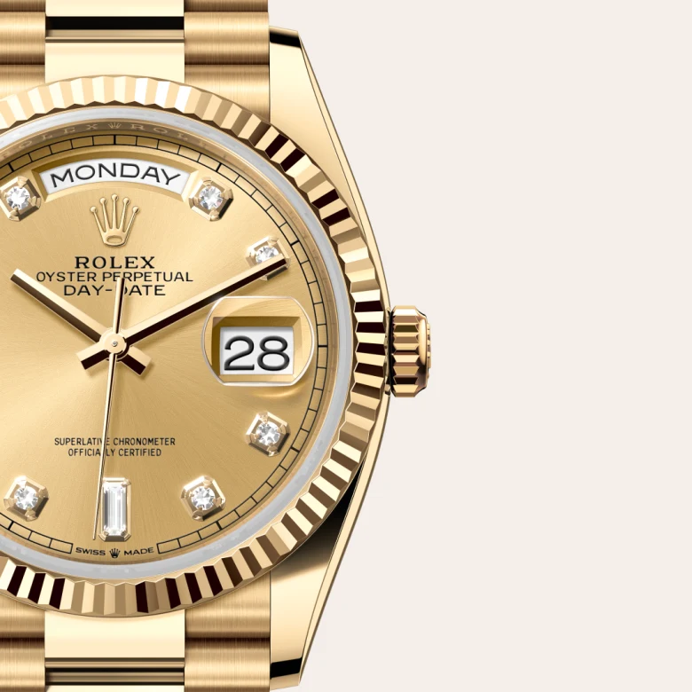Además, era idéntico al acanalado del fondo de la caja, atornillado a ésta por la misma razón, mediante herramientas específicas de Rolex. Con el tiempo, el estriado se convirtió en un elemento puramente estético, una auténtica característica distintiva de Rolex. En la actualidad, el estriado es una marca de distinción, en oro en este Day-Date 36.